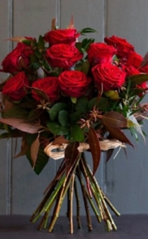 A Valentine bag cradles a lush bouquet of 12 red roses, their velvety petals a deep, romantic crimson, arranged in a tight, classic dome. Tucked between the blooms, fresh eucalyptus spills out in soft, silvery-green layers, adding airy texture and a clean, spa-like scent that balances the roses’ sweetness.