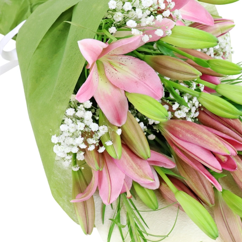 A lovely Mother’s Day gift presented in a stylish bag, featuring 7 pink lilies with a beautiful, fragrant scent. Soft stems of gypsophila weave through the lilies, adding fresh green texture and a light, airy feel around the flowers.