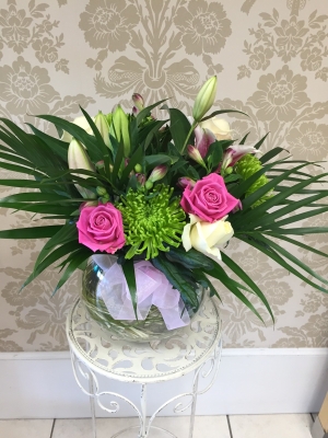 Stunning fat glass bowl containing seasonal flowers ,just perfect for placing on a surface and admiring ,nothing else needed