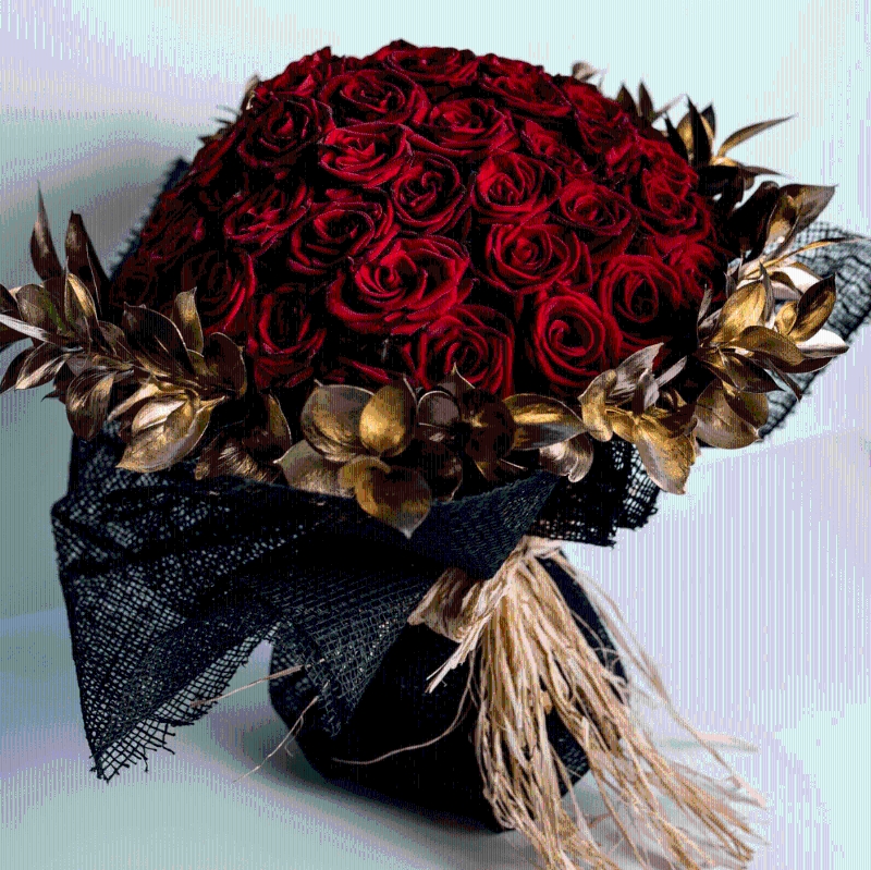 Prepare for the OOHH`s and AAHH`s when you present this unbelievable bouquet of over 75 rich red roses surrounded by decadent 24k rose gold and extravagant copper  ruscus