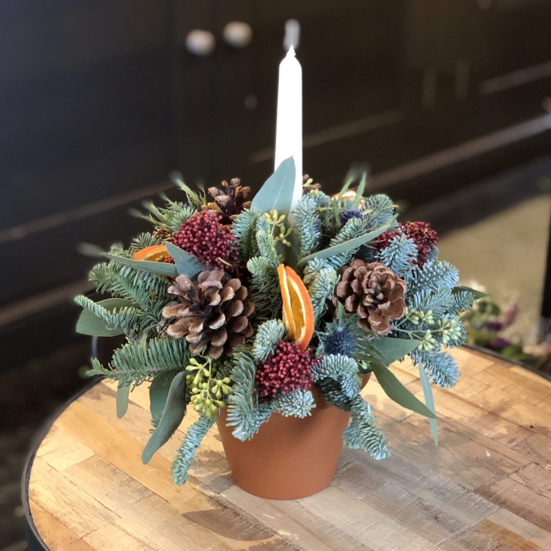 This design is created in a natural orange terracotta pot and comes with a tapered candle