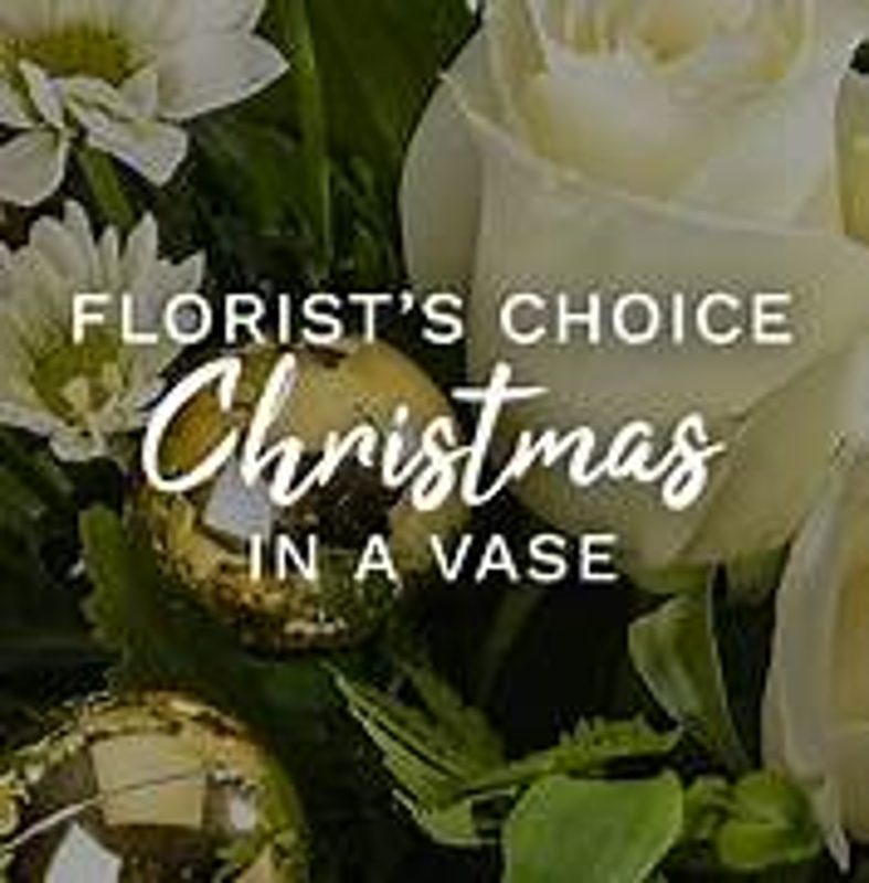 Keepsake glass vase  filled with Christmassy flowers and extras