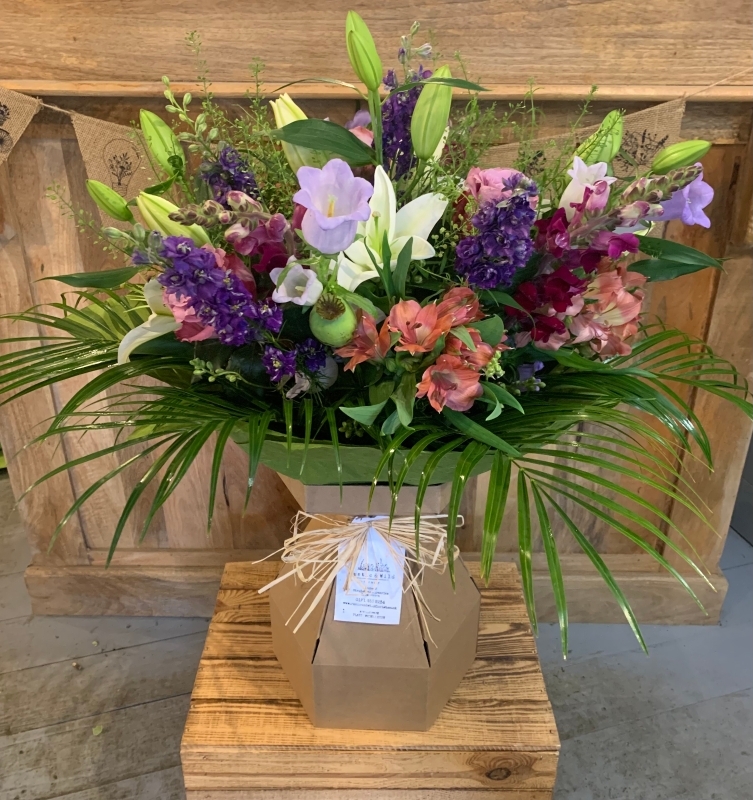 Comes in a box vase with it’s own water so requires no arranging by the recipient.