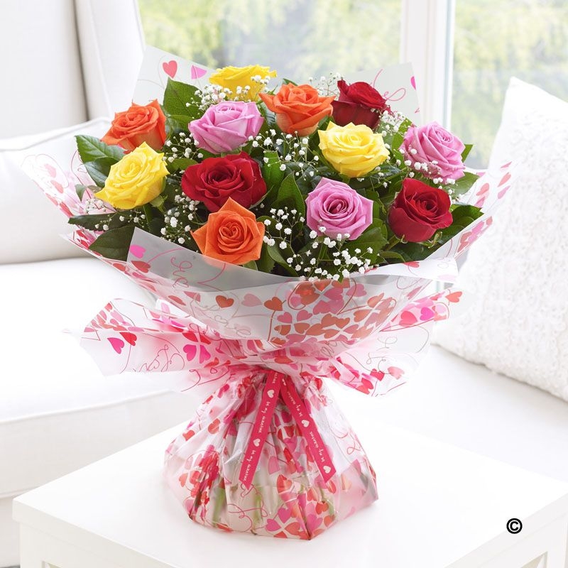 A lush and romantic mixed-colour rose bouquet, bursting with radiant reds, blush pinks, creamy ivorys, cerise pinks, pretty purples, vibrant oranges, delicate yellows and soft lilacs for a lush look