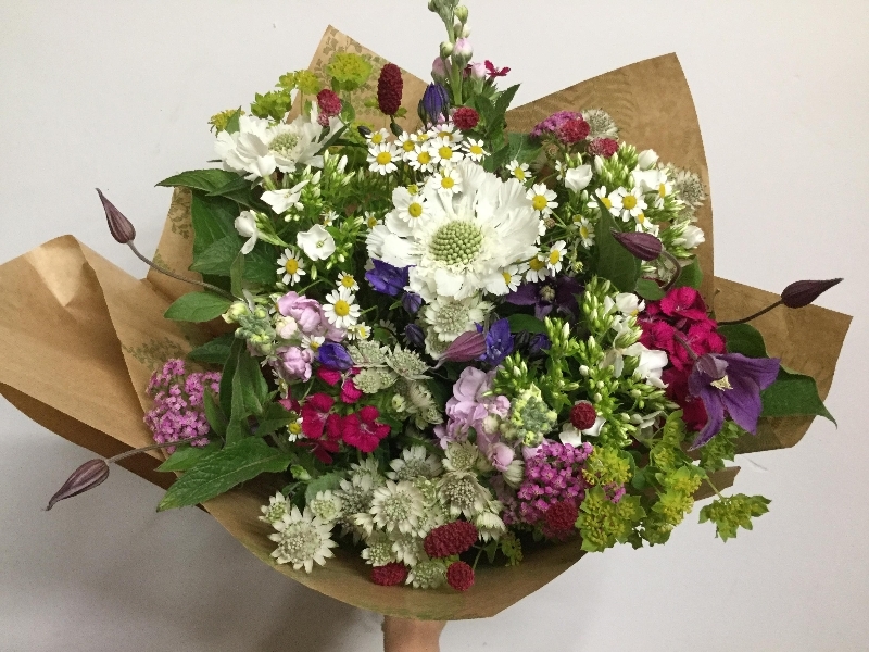 Lovely fresh mix of summer garden flowers wrapped in recyclable Kraft paper with a rafia bow