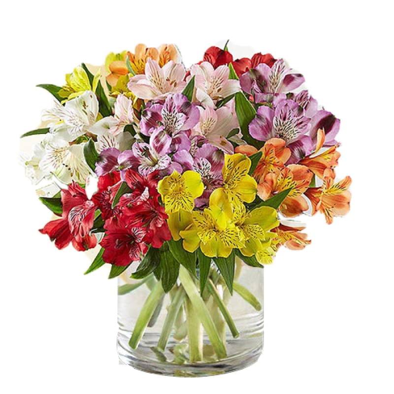 Our beautiful vase-ready alstroemeria are made up of 25 white, orange, red, yellow and purple stems in all various shades.