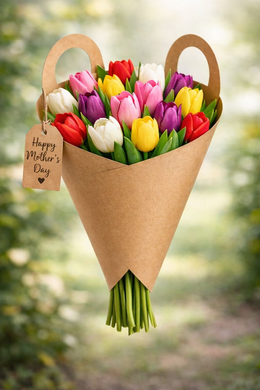 A beautiful bunch of bright tulips wrapped in a smooth kraft paper cone with soft kraft paper handles—easy for small hands to hold.