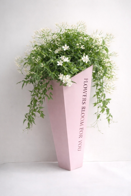 Nestled in a stylish pastel geometric container this charming display features delicate white jasmine blossoms and lush green foliage that cascade gracefully over the edges.