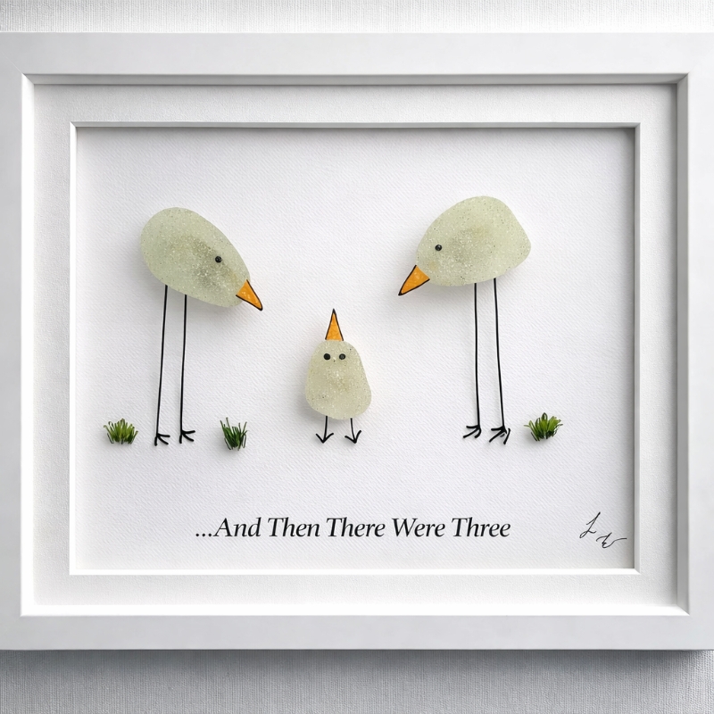 Inside the frame, three birds are arranged in a simple, balanced composition. Two larger birds— representing parents—stand on either side. They are made from pale green sea glass, each with a small black dot for an eye, a neatly shaped orange beak, and thin black wire legs that extend straight down.