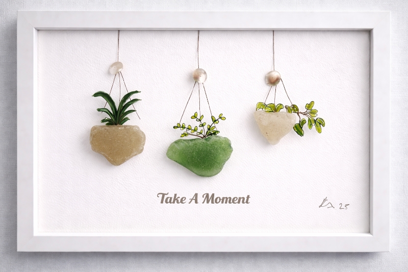 Take A Moment – Handmade Sea Glass Hanging Planter Art (Framed)