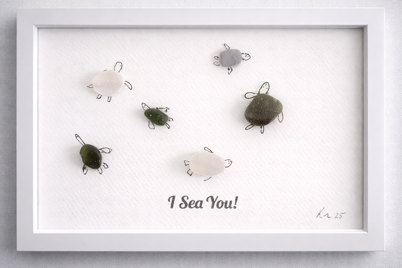 Set within a crisp white shadow box frame, the clean background enhances the organic shapes and subtle colours of the sea glass, giving the piece a modern, gallery-style finish. The phrase “I Sea You!” adds a lighthearted, coastal-inspired touch, while the artist’s signature completes this unique design.