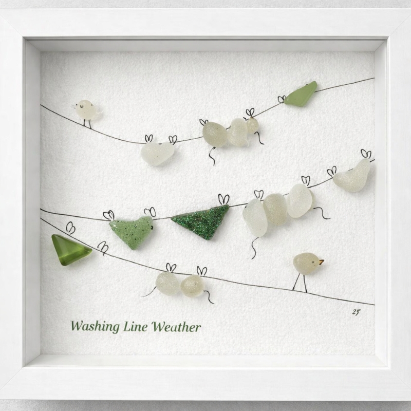 Add a touch of charm and gentle humour to your space with this handcrafted sea glass artwork, “Washing Line Weather.” Inspired by everyday outdoor moments, this piece captures a whimsical scene of birds perched along washing lines, surrounded by freshly hung laundry—including tiny sea glass “garments” that bring a playful twist to the design.