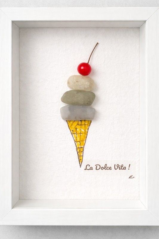 Bring a touch of playful elegance to your space with this handcrafted sea glass artwork, “La Dolce Vita.” Inspired by the sweetness of simple pleasures, this piece features a charming ice cream cone created from naturally tumbled sea glass, topped with a vibrant cherry for a pop of colour.