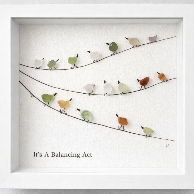 Bring movement, texture, and meaning into your space with this beautifully handcrafted sea glass artwork, “It’s A Balancing Act.” This intricate piece captures a lively scene of birds perched along gently curving branches, symbolising the delicate balance of everyday life.