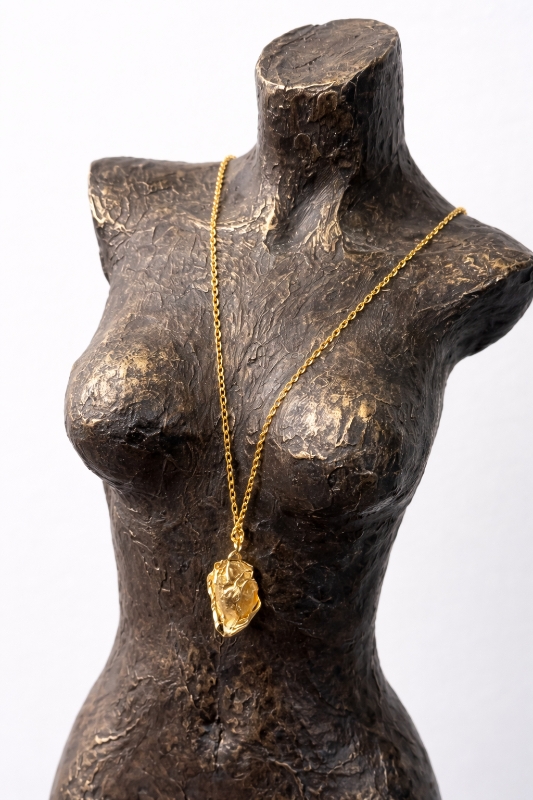 Suspended on a fine 18inch chain, the organic shape of the pendant adds a natural, sculptural quality—making it a standout yet versatile accessory. Displayed on a form for scale and styling inspiration, this necklace is perfect for layering or wearing as a bold, minimalist statement.