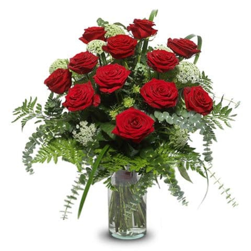 12 luscious red roses with fresh greenery presented in glass keepsake vase