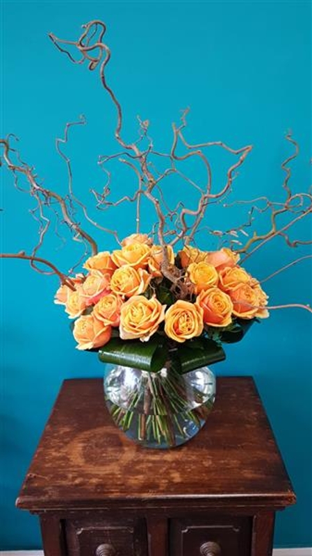 Extra large globe Glass vase overflowing with 24 fresh creamy roses  in colour of your choice surrounded by manipulated aspidistra leaves and kooky twisted willow