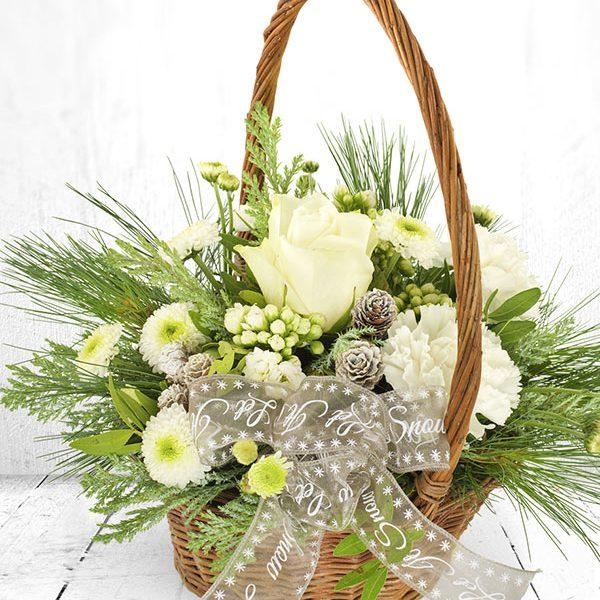 Wicker basket overflowing with silver and white Christmas flowers with designer bow.